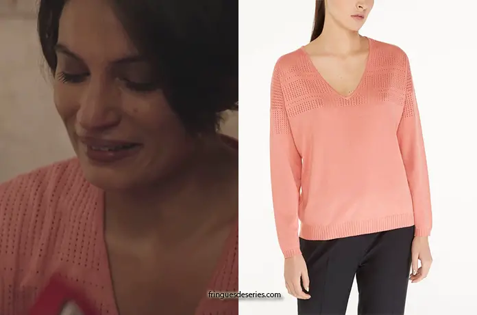 Noémie (Lucia Passaniti) est très malheureuse à la fin du 1er épisode d’Ici tout commence. Elle porte un pull rose ajouré, col en v. On le trouve ici.