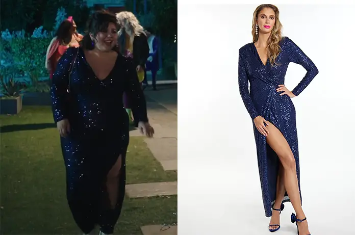 Coline (Talina Boyaci) portait une longue robe bleue fendue à paillettes, façon Dynastie.