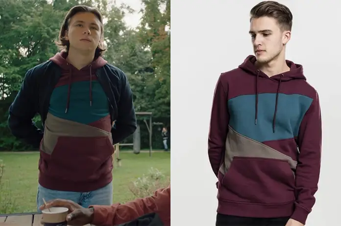 Lionel (Lucien Belvès) porte ce sympathique sweat à capuche bordeaux, avec empiècements de couleur, dans Ici tout commence 544.