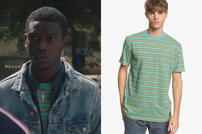 Un sympathique follower me signale ce joli t-shirt bleu vu sur Enzo (Azize Diabaté) dans l’épisode 18 d’Ici tout commence. Non, Enzo ne porte pas que des fringues de filles. On trouve ce t-shirt ici, par exemple.
