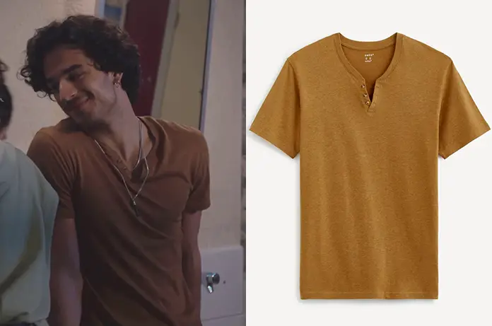 Greg (Mikaël Mittelstadt) essaie la spontanéité dans Ici tout commence 118 ne portant un t-shirt couleur curry. On le trouve ici.