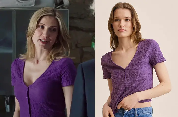 Constance (Sabine Perraud) porte un t-shirt violet texturé dans Ici tout commence 429. On le trouve ici