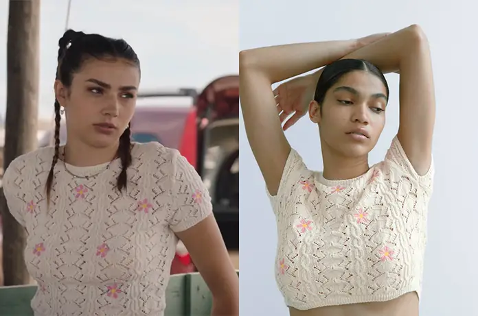Maya (Alexandra Favalli) porte un petit top en maille sur lequel on distingue des petites fleurs brodées dans Ici tout commence épisode 718.