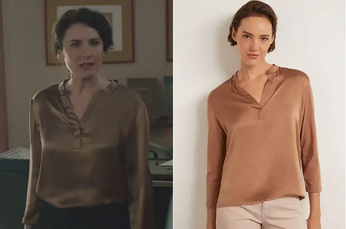 Clotilde (Elsa Lunghini) n’est pas contente dans Ici tout commence 125. Elle a mis un t-shirt en satin/soie couleur camel, col tunisien, pour le faire savoir à la cheffe Guinot. Il s’agit d’un modèle Gérard Darel (Réf: DNT01N2011701), qui existe en plusieurs coloris, mais qui semble en rupture de stock sur le net.