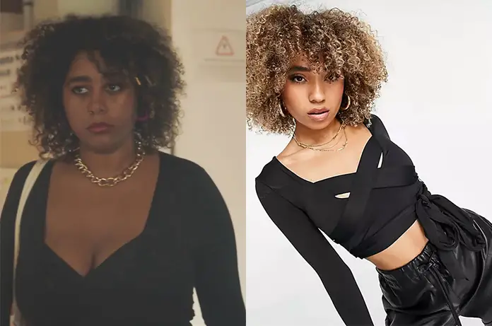 Billie (Margaux Aguilar) porte un top noir manches longues, avec des détails croisés sur le devant, dans Ici tout commence 509. On le trouve ici