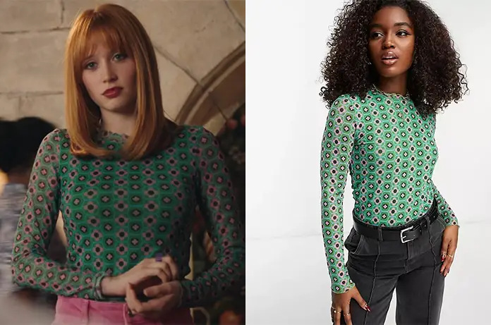 Ambre (Claire Romain) porte un top vert à longues manches dans Ici tout commence épisode 763. On trouve cet imprimé rétro ici