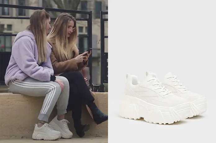 Charlène (Pola Petrenko) discute avec sa nouvelle amie dans Ici tout commence 100. Elle porte des baskets blanches plateforme. On les trouvait ici