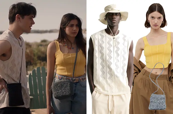 Pour Maya, elle a choisi un top jaune qu’on trouve ici, à prix mini. Elle l’a assorti avec un petit sac en crochet, celui en illustration est de Zara.