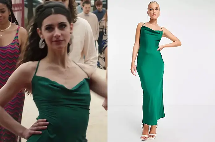 Célia (Rebecca Benhamour) préfère le vert. Une robe vert émeraude avec col bénitier que l’on trouve ici