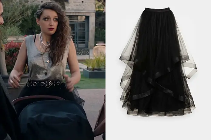 Jasmine (Zoï Sévérin) porte une robe noir retouchée par l’équipe d’ITC et un top argent qui est une création des costumières de la série.