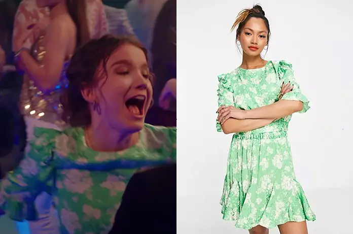 Kelly (Axelle Dodier) a préféré un ensemble vert (jupe et top) avec des fleurs imprimées. On trouve le top ici et la jupe ici