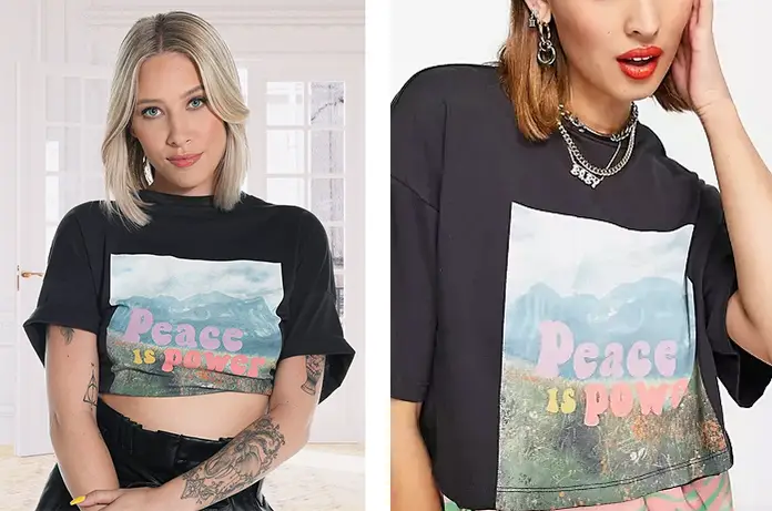 Elle porte un t-shirt « peace is power » qu’on trouve ici