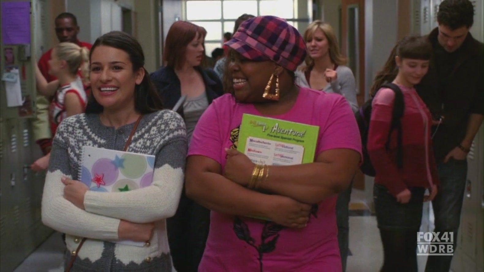 Dans l’épisode 14 de la saison 1 de Glee, on voit Rachel adopter un cardigan jacquard aux boutons dorés. de chez J-Crew.