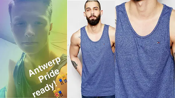 On vous l’avait dit que Jelle Florizoone aimait la marque Hilfiger : c’était déjà vrai il y a 4 ans. Si vous voulez le croiser aujourd’hui, allez donc faire un tour du côté de la Pride d’Anvers qui a débuté à 14hh. Jelle s’y amuse en débardeu