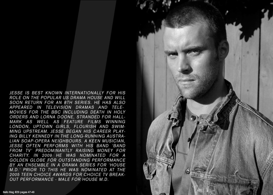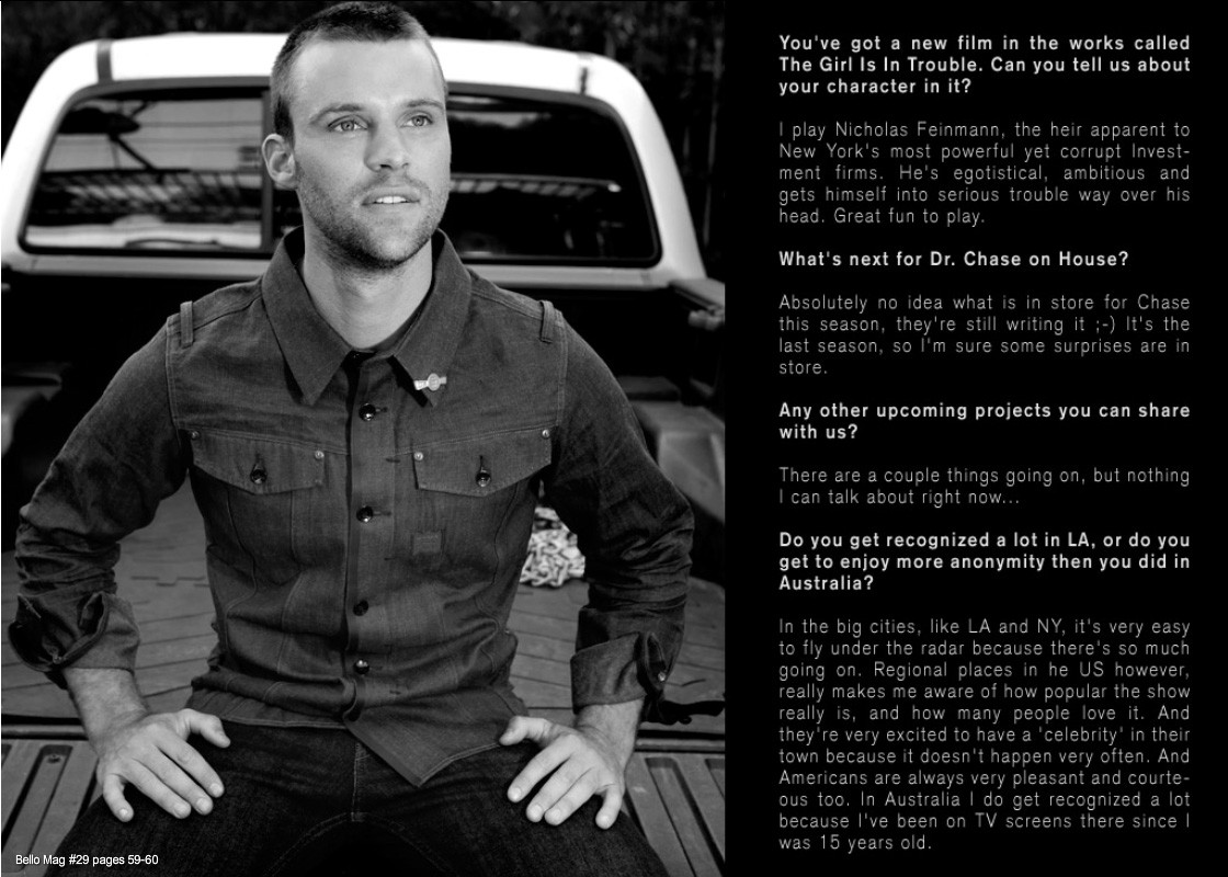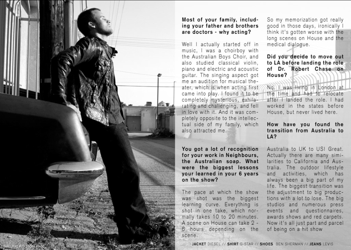 Jesse Spencer, connu pour être le dr Chase dans Dr House fait la une du Bello mag n°29. Le styliste Warren Alfie Baker a choisi beaucoup de pièces de la marque G-Star pour habiller l’acteur…