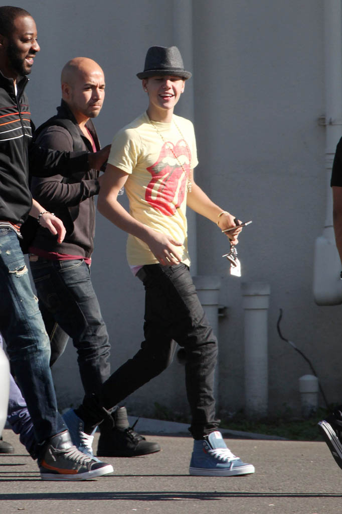 Nous vous proposons son t-shirt jaune Rolling Stones…et les plus attentifs verront que Justin reste fidèle à sa marque de boxers fétiche, American Apparel… C’était le jour du rose.