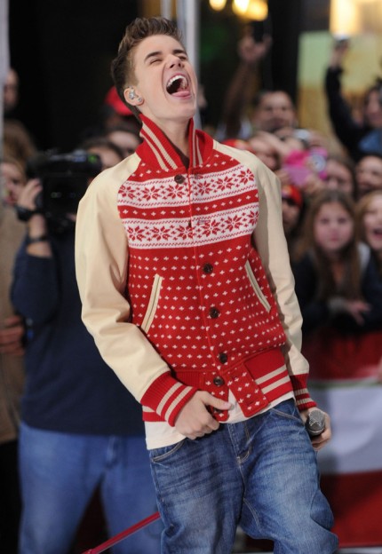 Ce 23 novembre, Justin Bieber enregistrait un concert en plein air, pour la chaine NBC, au Rockefeller Center de New York.ambiance de Noël assurée avec cette reprise de Drummer boy …Mais plus tôt, dans la matinée, Justin participait déjà au direct de l’émission TODAY où il s’est fait remarquer par une veste particulièrement laide, qui ne coûte pas moins de 1350 €. Il s’agit d’une veste cuir et laine jacquard de Junya Watanabe.