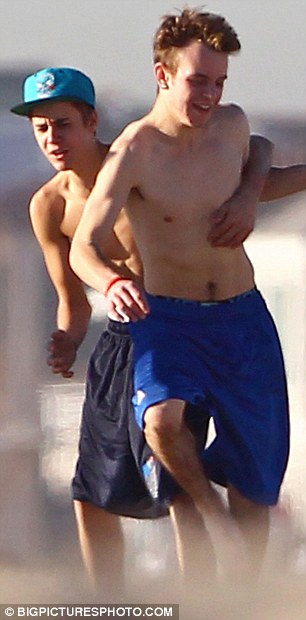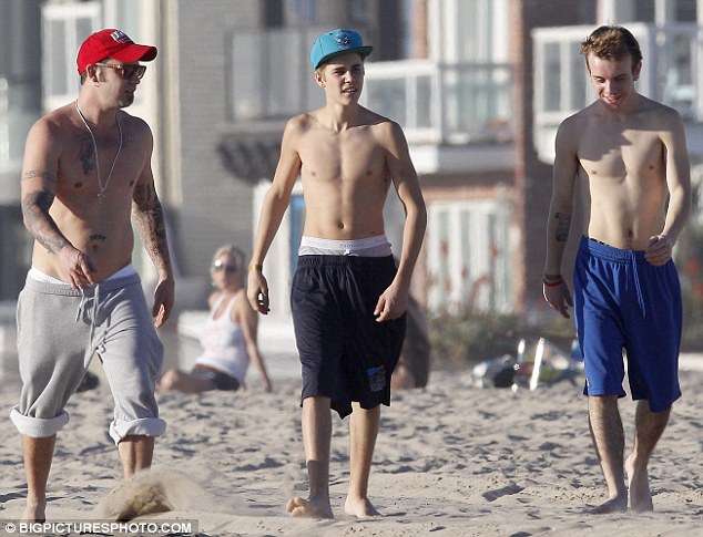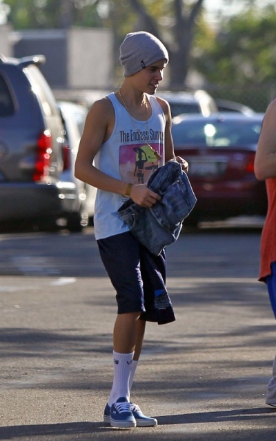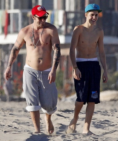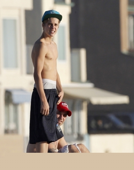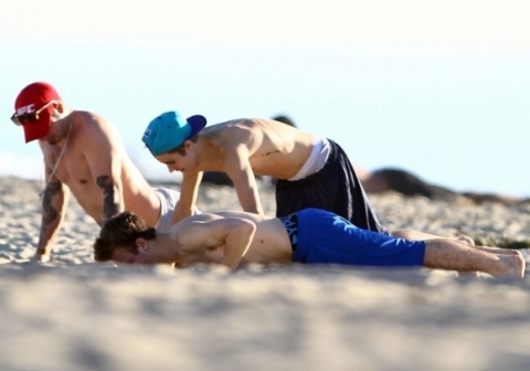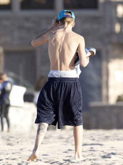 Ce mercredi 4 janvier, Justin Bieber a décidé d’éliminer quelques toxines avec papa et son BFF Ryan Butler (best friend forever)à Venice Beach (Californie). Il portait pour l’occasion un débardeur The endless summer, le même que portait Zac Efron en août dernier. Il est clair que le chanteur canadien ne peut pas encore rivaliser en musculature avec le héros de High School Musical, mais il s’y entraîne. Mais ce qui a surtout provoqué le buzz lors de cette sortie est l’exhibition du nouveau tatouage de Justin, un Christ, un Ecce homo (tapez ces mots dans Google images, et vous verrez) renforçant l’esprit religieux du jeune homme. Quelques pompes, un peu de jogging, un peu de lutte et l’invasion d’une horde de donzelles échaudées, en bikini…Justin Bieber s’est bien amusé.