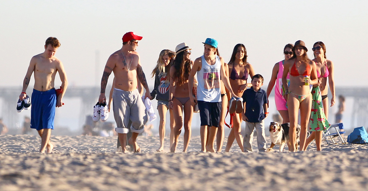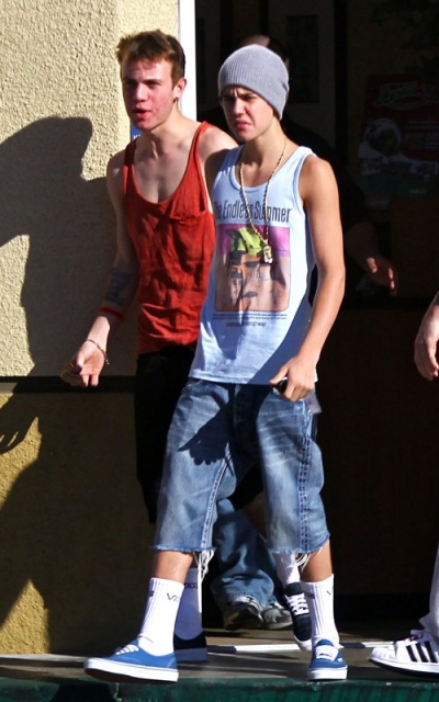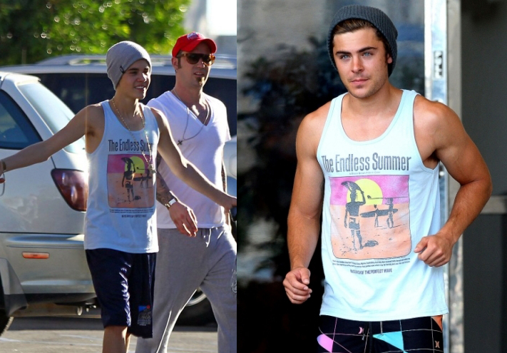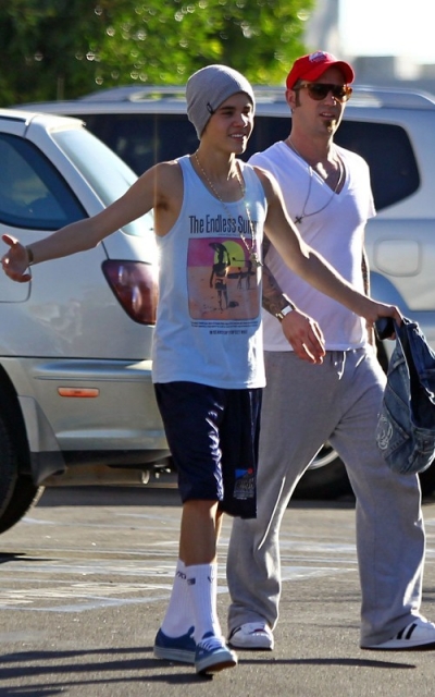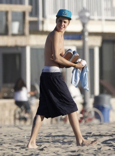 Ce mercredi 4 janvier, Justin Bieber a décidé d’éliminer quelques toxines avec papa et son BFF Ryan Butler (best friend forever)à Venice Beach (Californie). Il portait pour l’occasion un débardeur The endless summer, le même que portait Zac Efron en août dernier. Il est clair que le chanteur canadien ne peut pas encore rivaliser en musculature avec le héros de High School Musical, mais il s’y entraîne. Mais ce qui a surtout provoqué le buzz lors de cette sortie est l’exhibition du nouveau tatouage de Justin, un Christ, un Ecce homo (tapez ces mots dans Google images, et vous verrez) renforçant l’esprit religieux du jeune homme. Quelques pompes, un peu de jogging, un peu de lutte et l’invasion d’une horde de donzelles échaudées, en bikini…Justin Bieber s’est bien amusé.