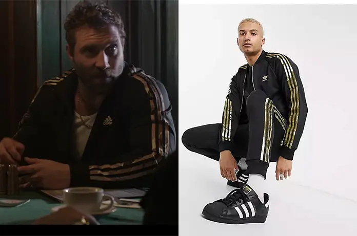 Bob Goodwin (Jai Courtney) porte un survète noir aux trois bandes dans l’épisode jaune de Kaléidoscope sur Netflix.