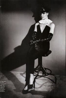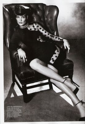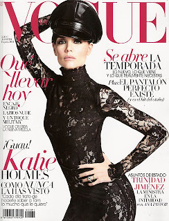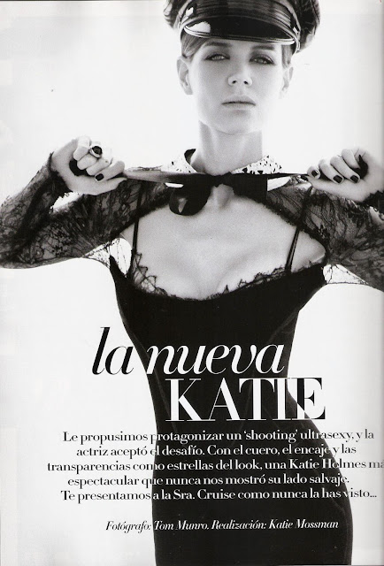 Katie Holmes comme vous ne l’avez jamais vue…Voilà le titre sur la une du Vogue espagnol de ce mois d’août…Et effectivement, en voyant les photos, on se dit qu’elle est bien loin la petite Joey de la série Dawson. Devant l’objectif de Tom Munro, madame Cruise se la joue princesse SM, avec des références explicites au Portier de nuit de Liliana Cavani.