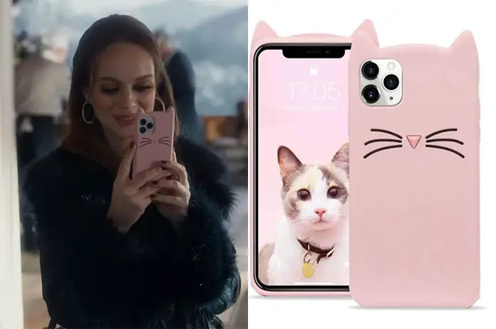 Dans Kitz 1×02, sur Netflix, Pippa (Krista Tcherneva) aura bien des soucis avec son téléphone, mais pas avec sa coque rose oreilles de chat. On en trouve ici pour divers modèles de téléphones