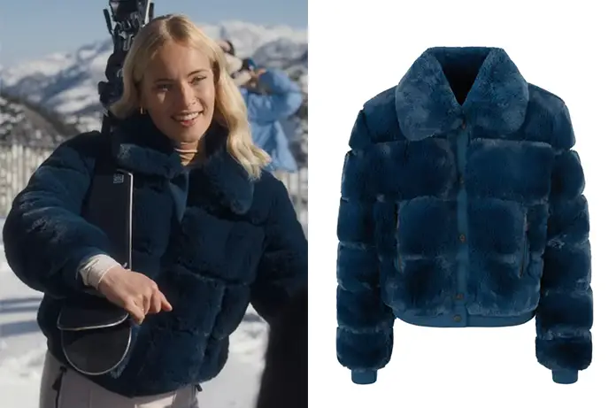 Vanessa (Valerie Huber) porte une doudoune bleue en fausse fourrure pour skier dans l’épisode 4 de Kitz. On la trouve ici