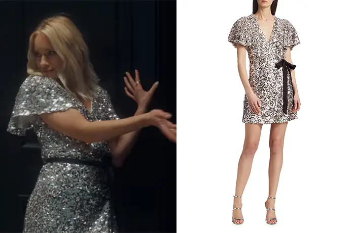 Vanessa (Valerie Huber) retrouve le moral dans sa robe à paillettes. Il s’agit d’un modèle ROTATE Nirger Christensen, qui semble en rupture de stock.