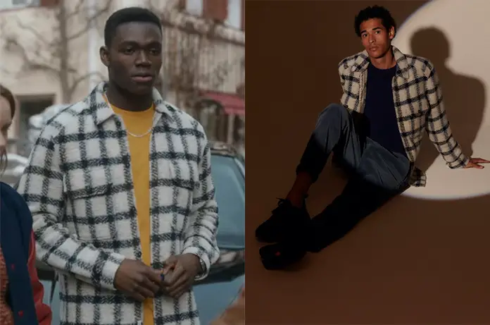 Dominik (Bless Amada) prête une voiture à Lisi dans l’épisode 3 de Kitz. Il porte une très belle veste à carreaux, qui fait partie de la collection hiver 2020 de Closed.