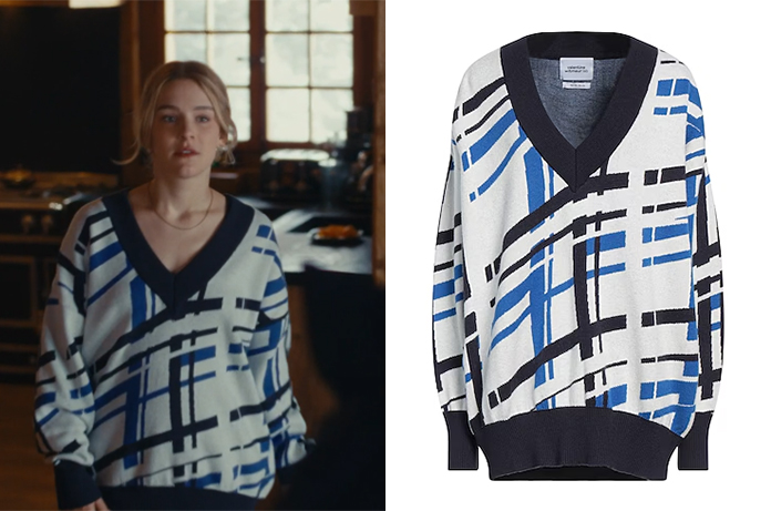 On parle d’un pull qui se distingue par son col en V prononcé et ses finitions en bord-côte large (bleu marine) au col, aux poignets et à la taille. Le motif abstrait mélangeant le bleu électrique, le noir et le blanc crée un visuel architectural très puissant à l’écran. Et fait intéressant pour la continuité stylistique du personnage, ce pull n’est pas une nouveauté. Louise le portait déjà dans l’épisode 2×04. Vous en souveniez-vous ?