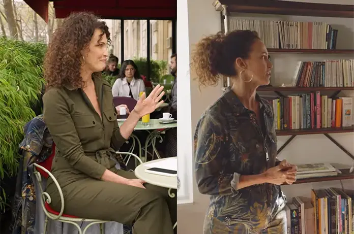 La jolie comédienne a choisi deux combis pour le programme : une kaki et une avec un imprimé feuillage. On reste dans la nature. Elle les a trouvées chez Carolina Ritzler
