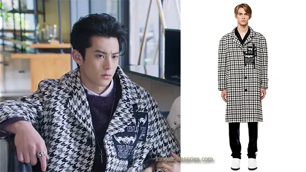 Dans l’épisode 21 de Meteor Garden, Daoming Si (Dylan Wang) portait également un manteau avec un motif dents de chien. Il est de la marque MISBVH, on en trouve ici.