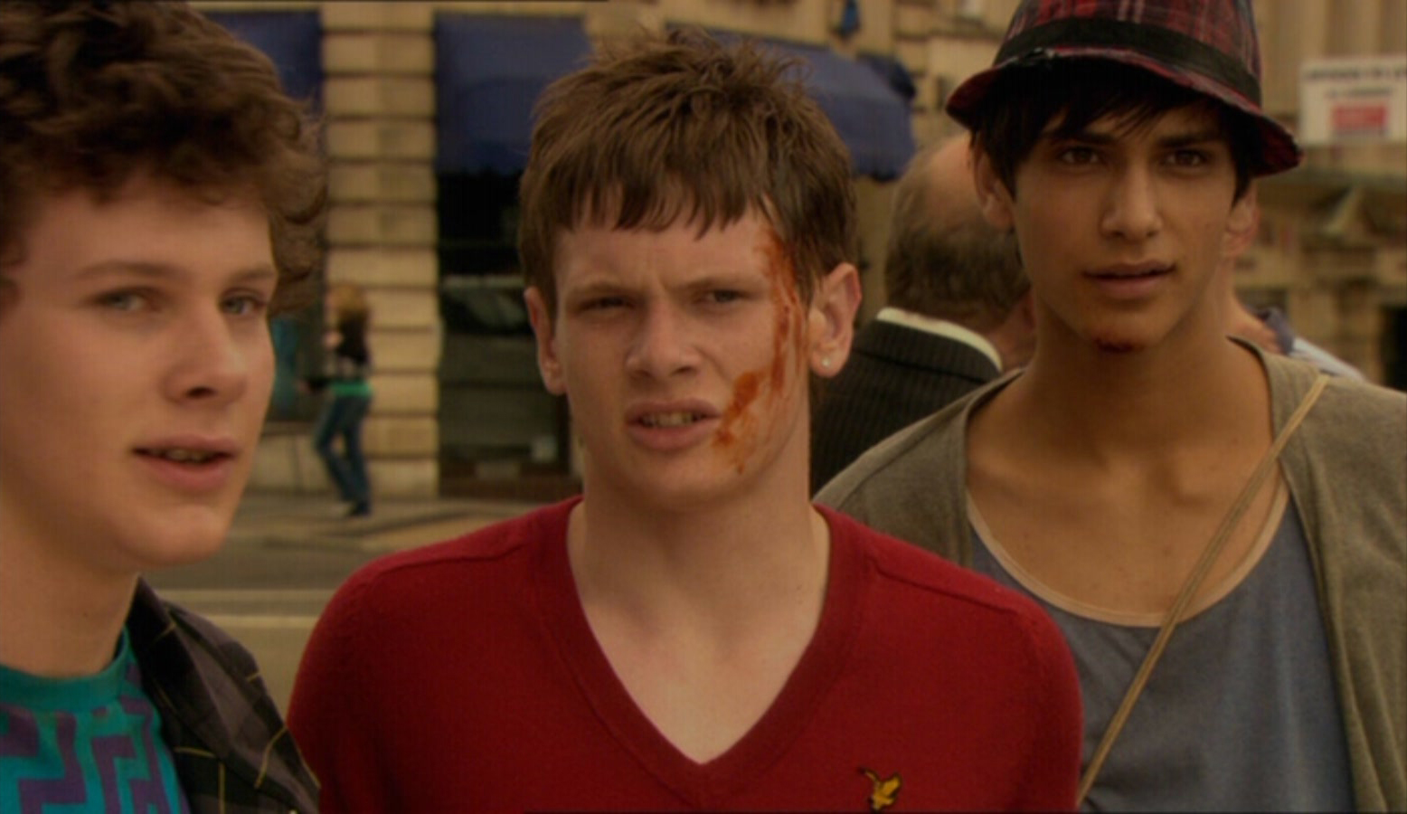 L’épisode 2 est centré sur l’audacieux Cook…celui qui dévoile toute son anatomie à son bahut dans le 1er épisode. Dans cet épisode-là, il est habillé d’un pull rouge Lyle & Scott Heritage.