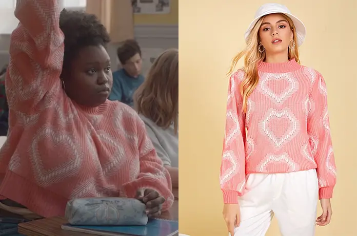 Chloé (Camille Léon-Fucien) montre ses connaissances en histoire au début du premier épisode de L’École de la vie. Son joli pull rose avec des cœurs est malheureusement sold out.
