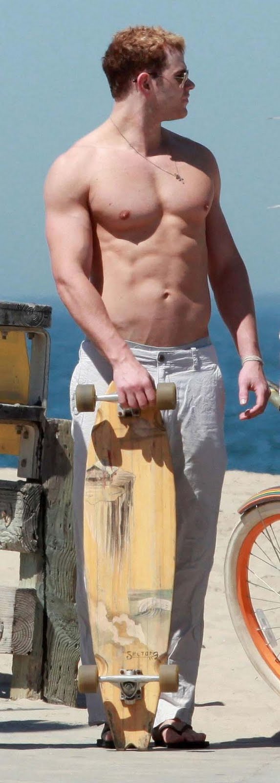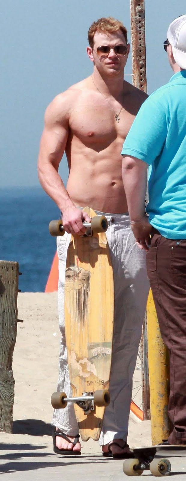 Au tour de Kellan Lutz de faire sa démo…Ca se passait début mai, sur une promenade de Santa Monica… Look tout à fait différent, puisqu’on a droit au pantalon blanc, au t-shirt imprimé et aux tongs. Le seul point commun, la marque Calvin Klein pour les caleçons…Pour rappel, Kellan est une des égéries de la marque
