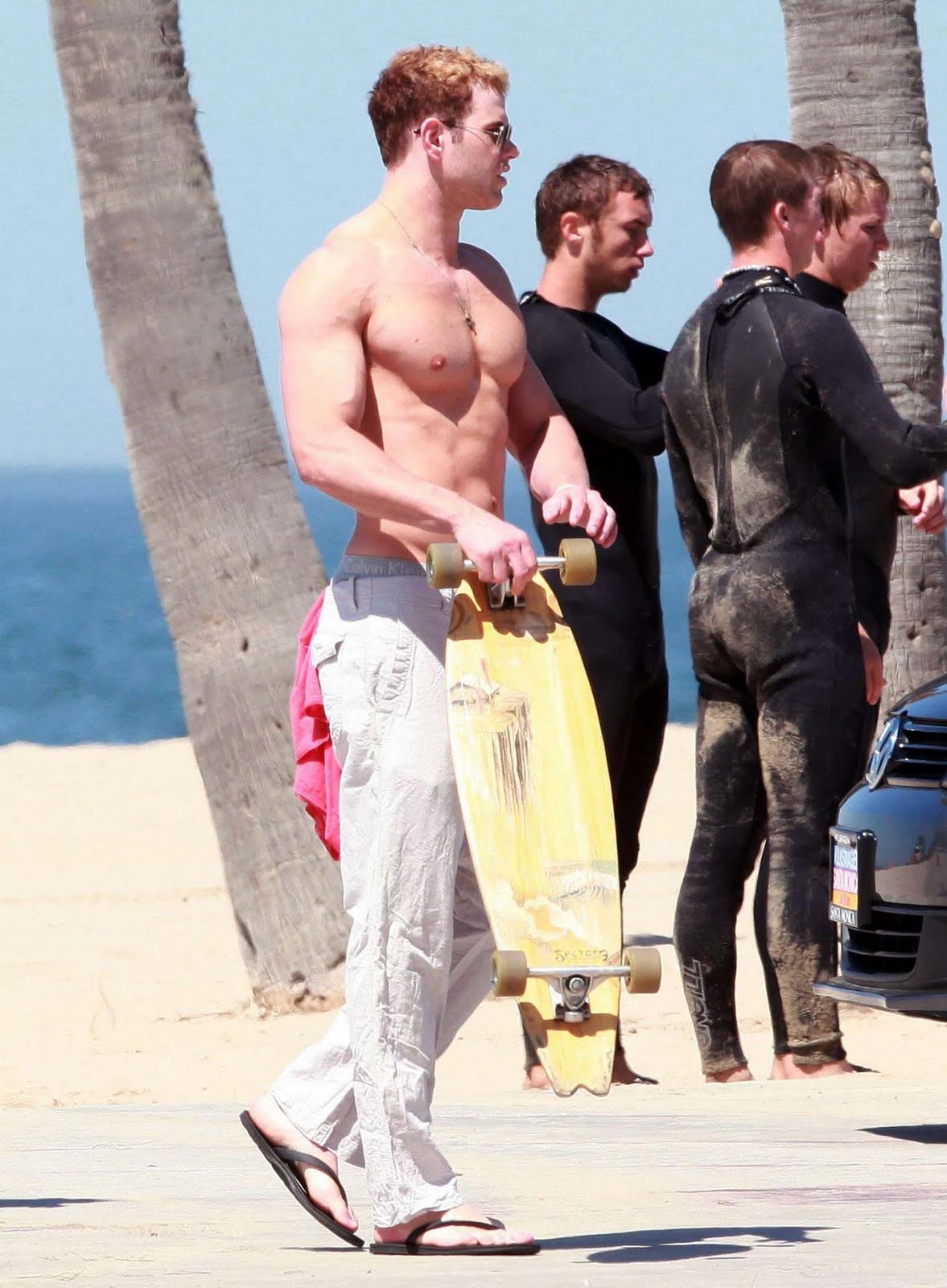 Au tour de Kellan Lutz de faire sa démo…Ca se passait début mai, sur une promenade de Santa Monica… Look tout à fait différent, puisqu’on a droit au pantalon blanc, au t-shirt imprimé et aux tongs. Le seul point commun, la marque Calvin Klein pour les caleçons…Pour rappel, Kellan est une des égéries de la marque