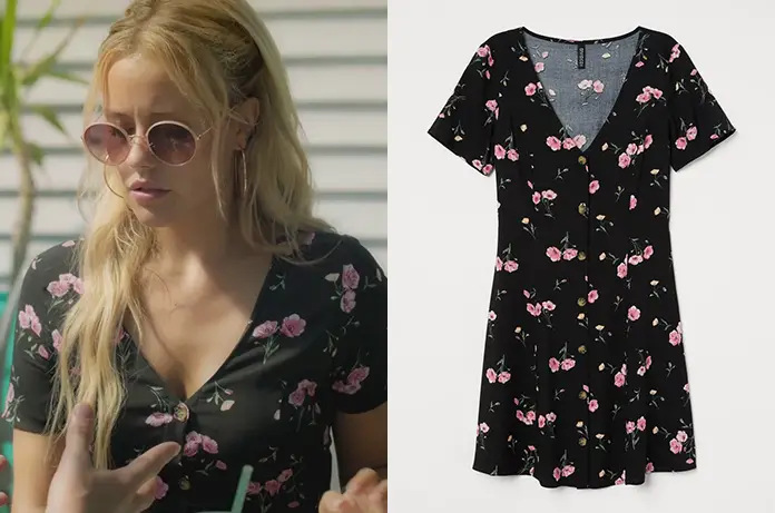 Lena (Jessica Lord) porte une robe noire, en viscose, à motif fleuri dans Lena, rêve d’étoile. De la marque H&m, cette robe est en rupture de stock