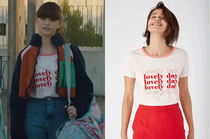 Roxane (Lou Lambrecht) portait ce mignon t-shirt ‘Lovely day’ dans Léo Matteï, brigade des mineurs 9×02. On le trouve encore ici