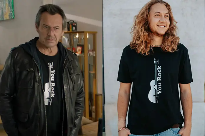 Dans Léo Matteï, brigade des mineurs 9×05, Léo (Jean-Luc Reichmann) porte un t-shirt noir avec une guitare et la mention « you rock ». On trouve ce t-shirt ici.