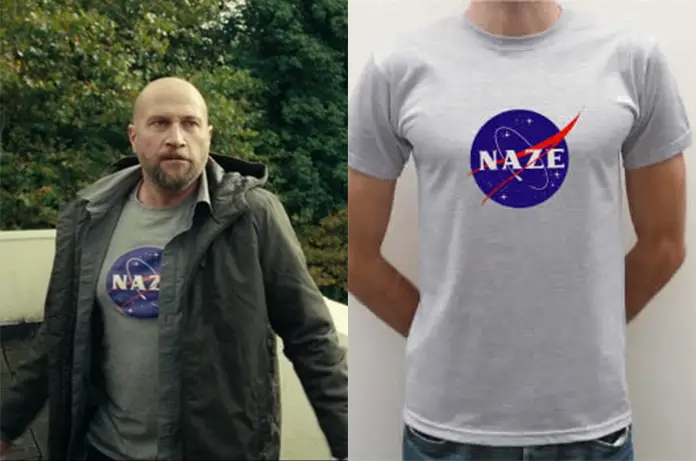 Alban (François Damiens) porte un t-shirt NAZE, un logo NASA parodié, dans les Amateurs 1×03, la nouvelle série comique de Disney +.