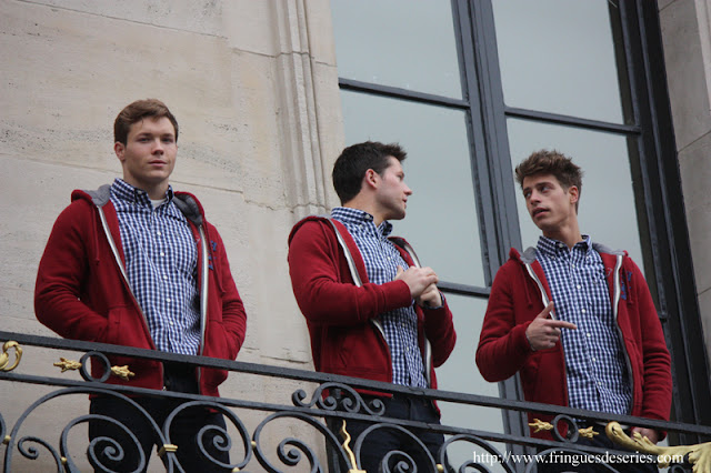 En prélude à l’ouverture de leur nouveau magasin bruxellois, Abercrombie & Fitch fait sortir devant l’immeuble les mannequins anglais, français, suédois qu’ils ont fait venir pour l’événement… Et le temps plutôt très automnal n’incite pas les jeunes hommes à dévoiler leurs torses…Ils n’en sont pas moins très sympathiques et s’ils n’attrapent pas la bronchite d’ici le 8 décembre, ils feront leur petite sortie chaque jour…
