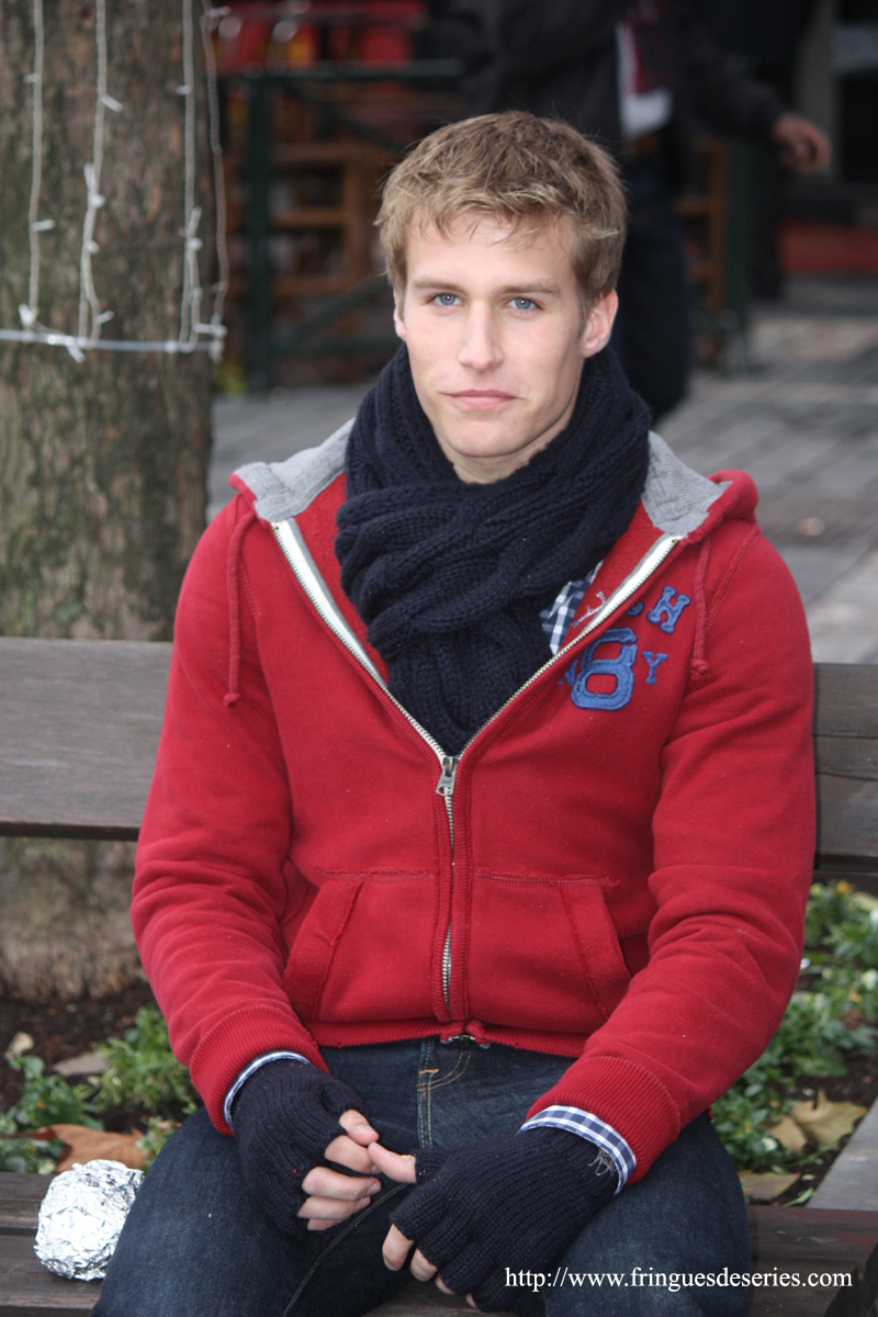 Troisième jour d’exposition des boys d’Abercrombie & Fitch aux fenêtres du magasin bruxellois et ils sont de plus en plus couverts…Finiront-ils en père Noël ? En se promenant dans le quartier, on pouvait tomber sur Corbin, jeune modèle malinois qui prenait sa pause déjeuner avant de réintégrer son balcon. Tout comme Kevin, il restera à Bruxelles pour travailler dans la boutique.