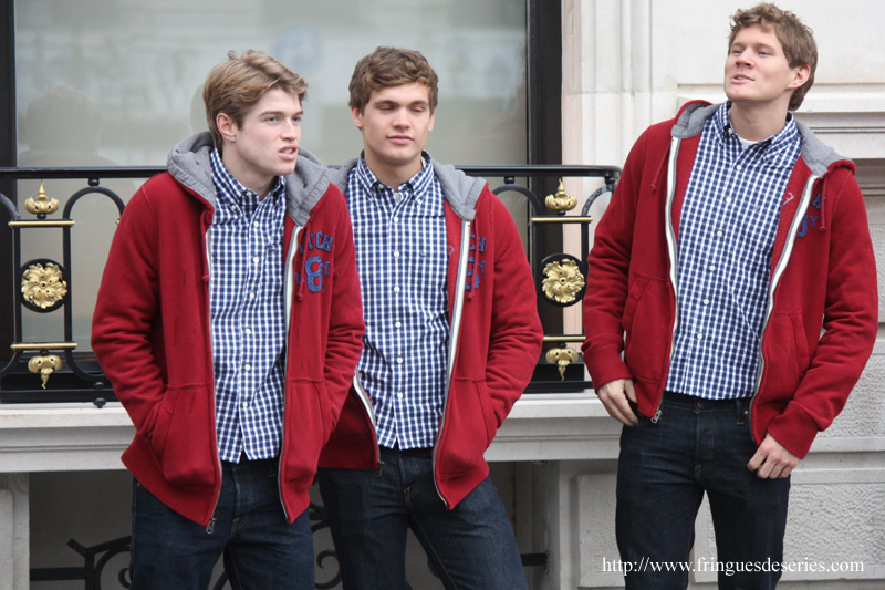 En prélude à l’ouverture de leur nouveau magasin bruxellois, Abercrombie & Fitch fait sortir devant l’immeuble les mannequins anglais, français, suédois qu’ils ont fait venir pour l’événement… Et le temps plutôt très automnal n’incite pas les jeunes hommes à dévoiler leurs torses…Ils n’en sont pas moins très sympathiques et s’ils n’attrapent pas la bronchite d’ici le 8 décembre, ils feront leur petite sortie chaque jour…