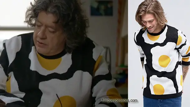 Impossible de ne pas remarquer le pull « oeufs sur le plat » de Claude (l’excellent Denis D’Arcangelo)… dans le 8e épisode de Les Engagés. On le trouvait chez ASOS, ici. On en a vu des similaires sur le site Lesara.