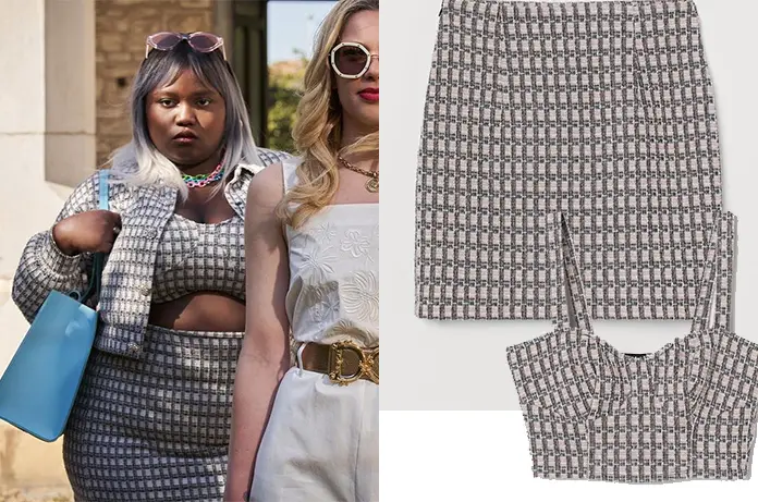 Naya (Camille Léon-Fucien), l’influenceuse, dite aussi la baronne dans Les Liaisons dangereuses porte un ensemble jupe, blazer, bustier en jersey texturé à motif jacquard. Rose poudré et noir.