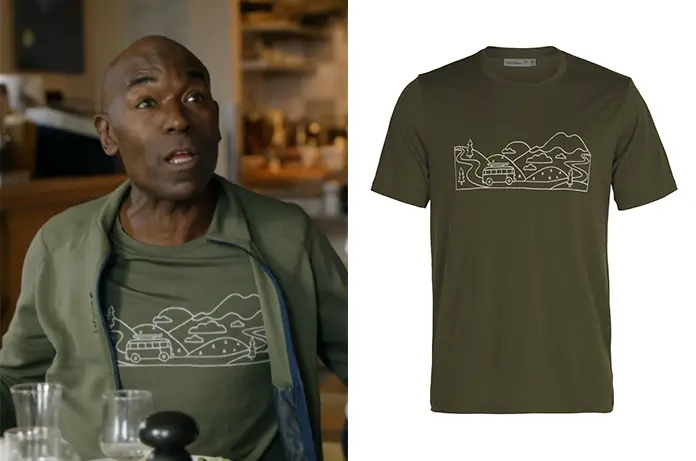Il porte un t-shirt kaki avec un dessin de montagnes.