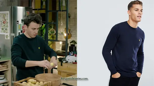 Dans l’émission culinaire d’RTL-TVi (ou VTM en flamand), Loïc, fou de cuisine, le jeune cuisinier prépare une tartiflette avec un pull bleu marine, dispo ici.