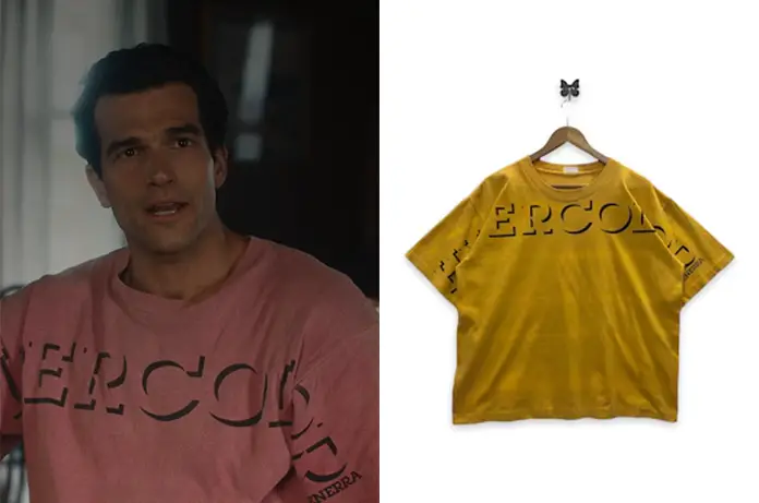 Dans l’épisode 4 de Love Story, John Kennedy Jr. (Paul Anthony Kelly) apparaît dans un look qui s’éloigne du polished Kennedy myth qu’on lui associe souvent. Il passe la journée dans un t‑shirt rose Hypercolor de la marque Generra, ample, graphique, très 90s, porté avec cette décontraction qui lui allait si bien.
