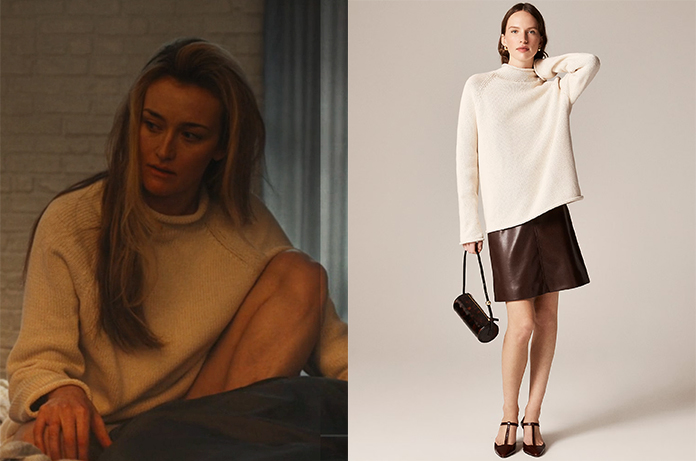 In a more intimate scene, Carolyn appears in a sweater of a similar shade: a vintage J.Crew piece, typical of early‑90s American silhouettes. Dense knit, relaxed rollneck, slightly masculine cut — a rare find today, yet one whose spirit still lives on in the brand’s current collections. J.Crew even offers a very close modern reissue, the 1988 Rollneck Sweater, which brings back that simple, sturdy look Carolyn was known to favor.