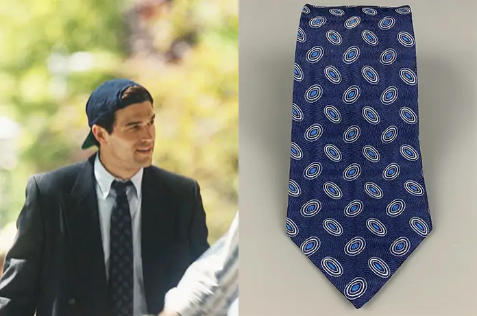 Pour recréer cette silhouette si particulière, le chef costumier Rudy Mance (déjà connu pour son travail sur Dahmer) n’a rien laissé au hasard. Il a choisi une cravate en soie Hermès.